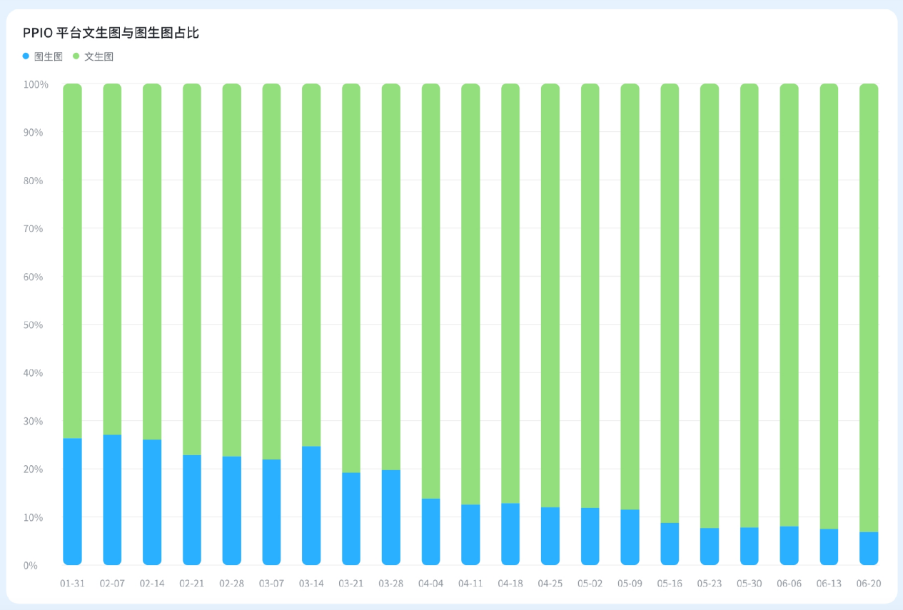 正在生图范畴,文生图模子的利用占比从1月份的70%增加到6月份的90%。生态结构普遍。SD1.5系列模子的利用量正在2月份高达65%摆布,用户愈加侧沉于图生视频而非文生视频。