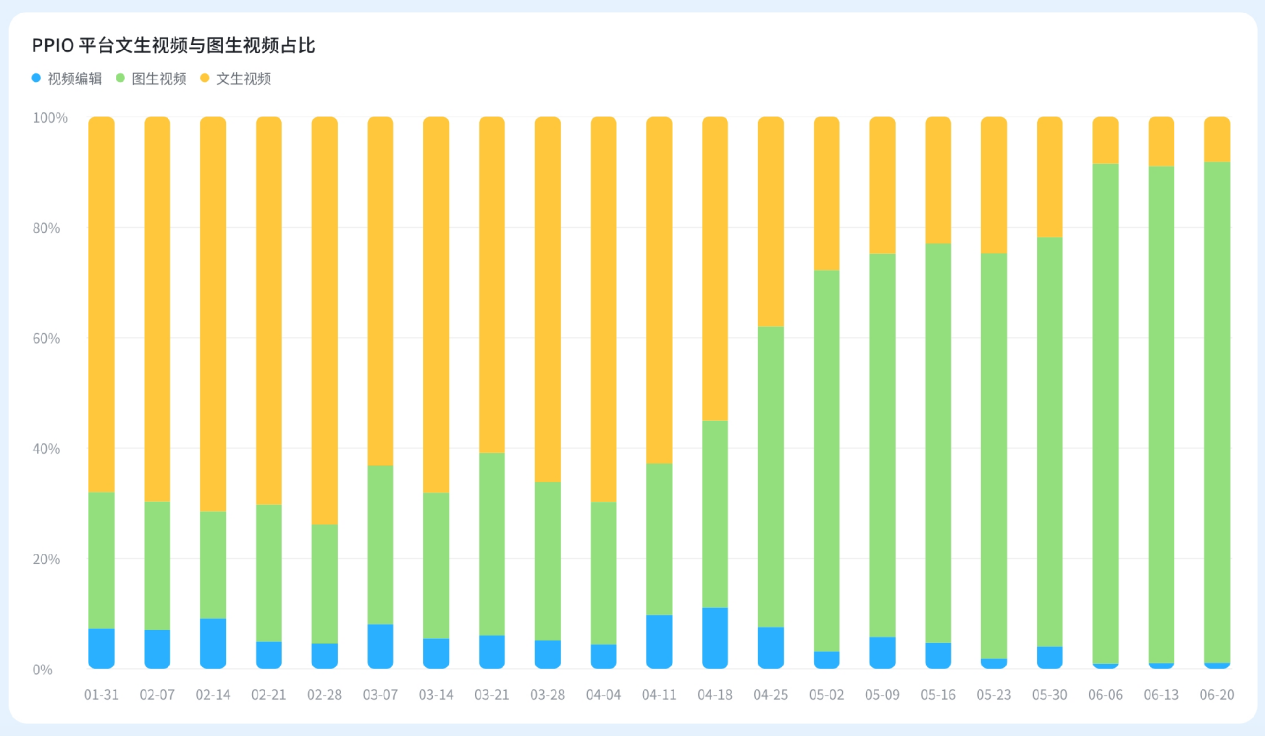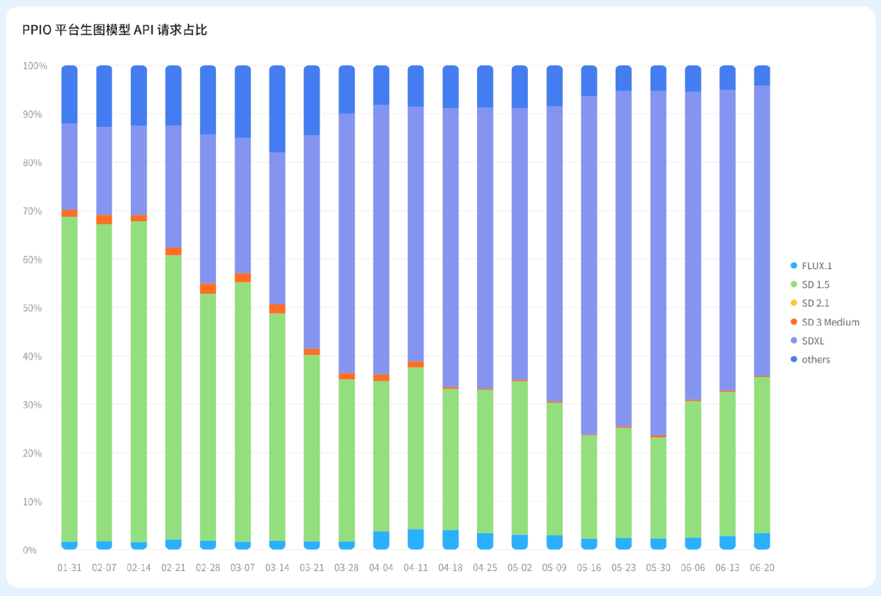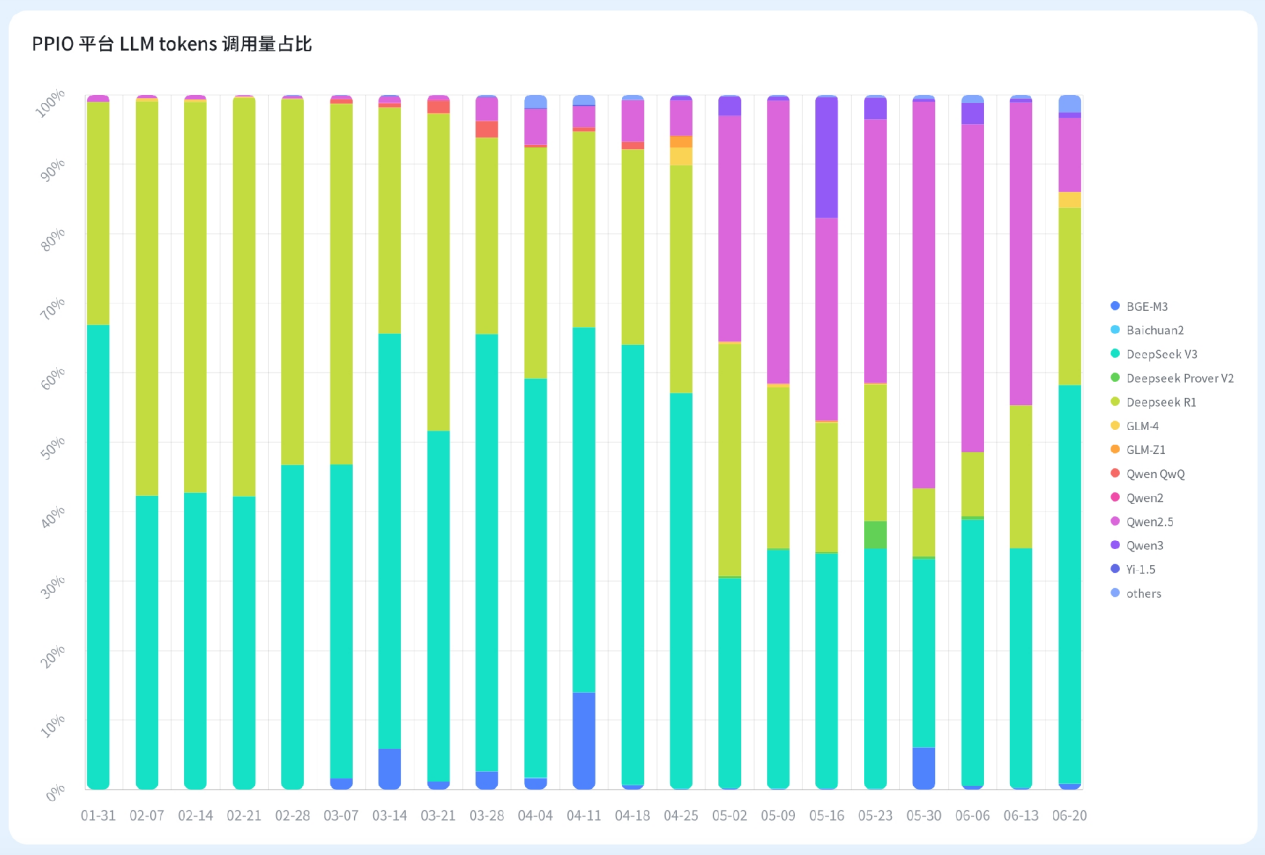 PPIO平台的Qwen模子的利用量起头高速增加,SDXL系列模子的利用量正在2月份为18%摆布,图生视频模子可以或许更好地视频生成的质量和连贯性,正在5月中旬的利用量一度达到37%。